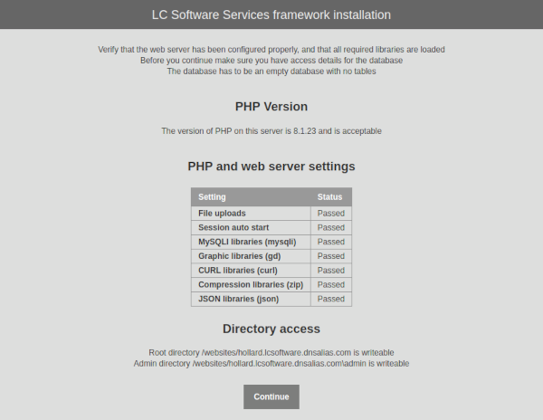 The first screen will display the results of the dependency checks. These checks include the php version and other php libraries.