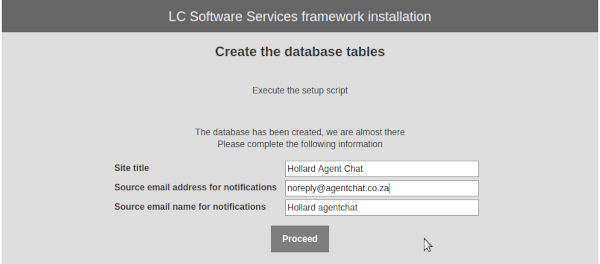 Navigate to the URL and execute the install.php script (https://xxxx.agentchat.co.za/install.php)